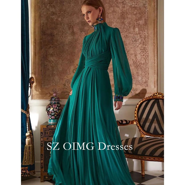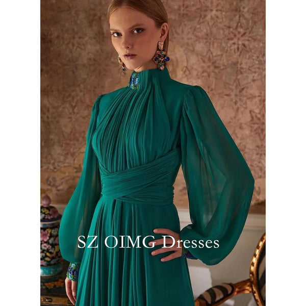 OIMG Gorgeous Fashion High Neck Green Prom Dresses Puff Sleeves Customized Elegant Satin Vintage Gowns Formal Party Dress