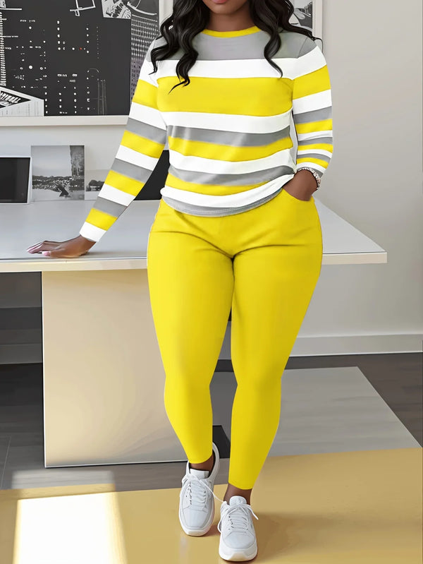 Plus Size Two Piece Sets Colorblock Casual O-Neck Long Sleeve Top and Long Pants Set Women's Plus Size Clothing Matching Sets